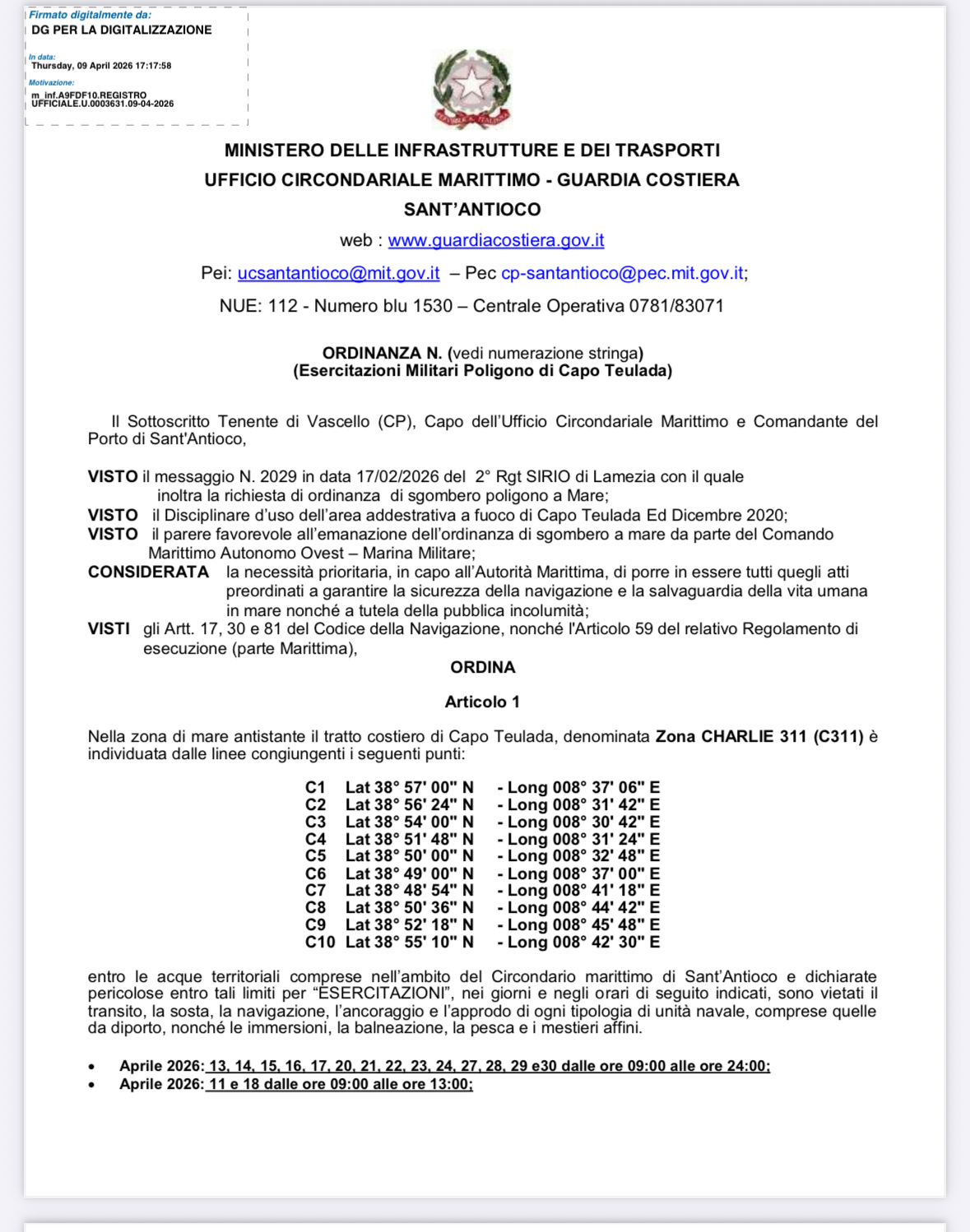 Trasmissioni ordinanze 11 E. 12/2026 esercitazioni militari poligono capo teulada